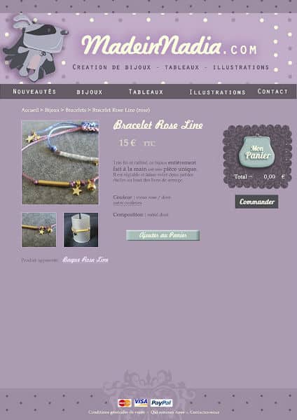 Le site a été intégré avec le CMS SPIP et l’outil de boutique en ligne Thélia, habillé des designs "made in Nadia".